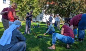 Inhaltlich und auch methodisch stiegen wir dann ins Thema ein. Um zu erfahren, wie wichtig ein Halt ist, gingen wir spielerisch mit Karabinerhaken auf eine Bergtour, bei der wir erleben durften, wie wichtig es ist, dieses gesichert zu tun. Von der Praxiserfahrung ging es in den Austausch. Hier trugen wir zusammen, was uns Halt gibt. Der Austausch untereinander erweiterte unseren Erfahrungsschatz. Mit der anschließenden Aufgabe aus der Schreibwerkstatt vertiefte jede/r Einzelne noch, was einen persönlich hält. In der persönlichen Zeit setzte sich jedes Gruppenmitglied mit dem Labyrinth und seinem Halt auseinander – schriftlich, gedanklich, in Bewegung – was einem gut tat.