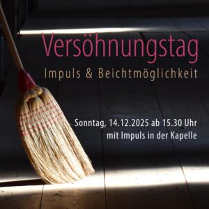 In unseren Beziehungen im Alltag gelingt uns nicht immer alles. Manchmal ärgern wir uns über uns selber, über misslungene konfliktreiche Gespräche, über Streit in Ehe oder Familie, über Unversöhntheit. Im ehrlichen Reflektieren erkennen wir, nicht nur die anderen haben Schuld – auch ich hatte meinen Anteil daran. Am Versöhnungstag, Sonntag, 14. Dezember 2025, laden wir ein zum Empfang des Sakramentes der Versöhnung. Beginn ist um 15.30 Uhr in der Kapelle mit einem kurzen Impuls, anschließend stehen Priester in den Beicht- und Gesprächszimmern im Klostergebäude zur Verfügung.